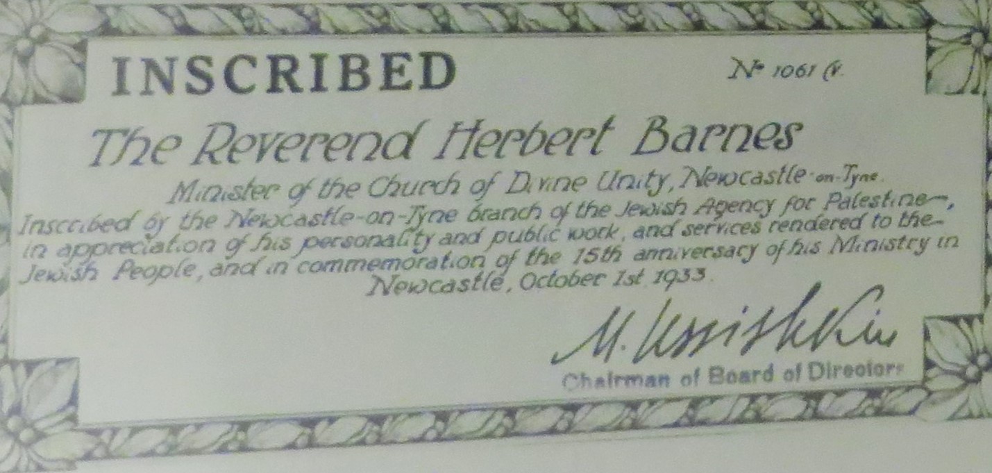 The public works referred to included serving on both Newcastle Public Libraries Committee and Education Committee. This inscription in the ‘Golden Book’, given on the recommendation of the Jewish Agency for Palestine, was said to be the highest form of tribute the Jews can pay to those whom they wish to honour. Speeches would be made by Rabbi J Kyanski and Reverend Emmanuel Drukker from the Jesmond Synagogue. Members of Mr Barnes’s church were to be individually invited to the presentation. It was reported in Reverend Barnes’ obituary in ‘The Daily Journal’, that Herbert Barnes was ‘one of the few gentiles to have had their names inscribed in the Golden Book’