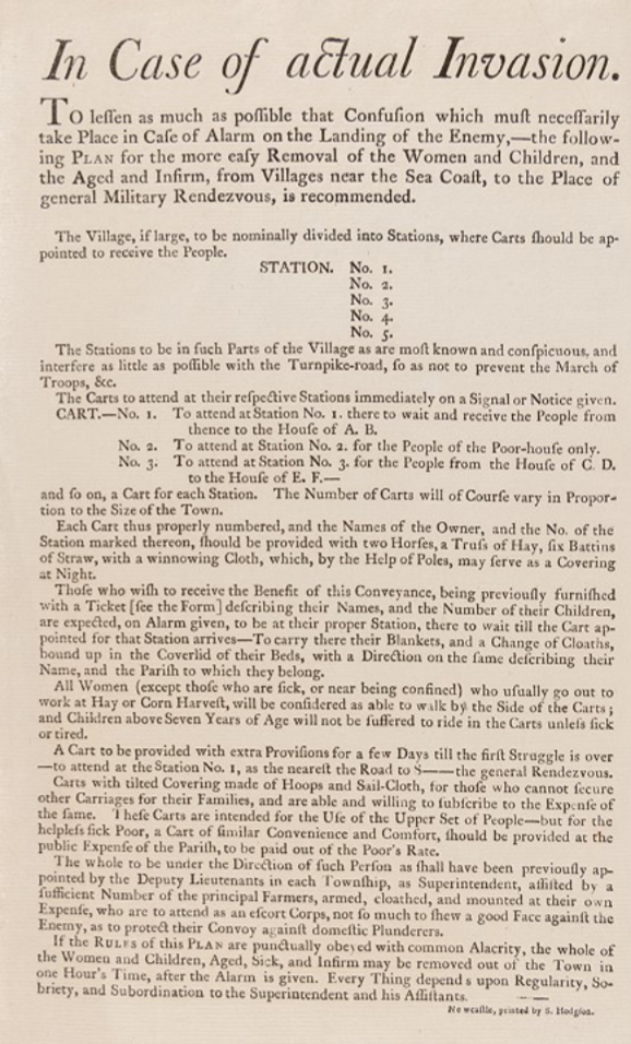 The broadsheet concludes ‘If the RULES of this PLAN are punctually obeyed with common Alacrity, the Whole of the Women and Children, Aged, Sick and Infirm may be removed out of the Town in one Hour’s Time, after the Alarm is given. Every Thing depends upon Regularity, Sobriety, and Subordination to the Superintendent and his Assistants’.