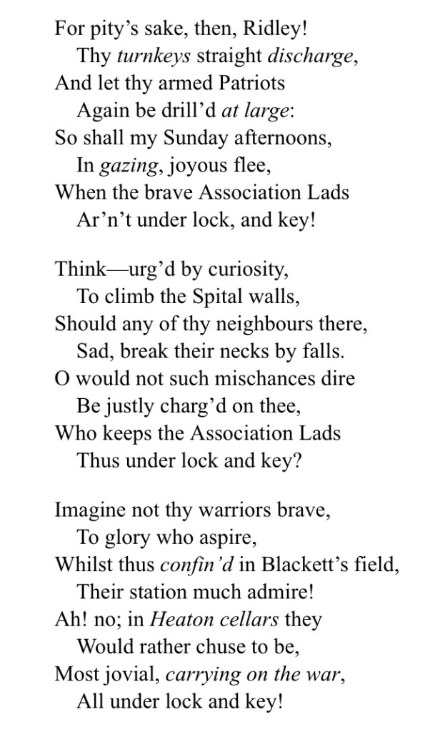 A song ‘Blackett’s Field’ by John Shield of Newcastle, written in late 1804, attacked the way Newcastle Armed Association volunteers were treated at drill by Ridley. The song claims that the soldiers would rather be drinking in ‘Heaton’s cellars’ (but this appears to refer to a pub rather than our township, in which as we have just seen, few people then lived) than marching.
