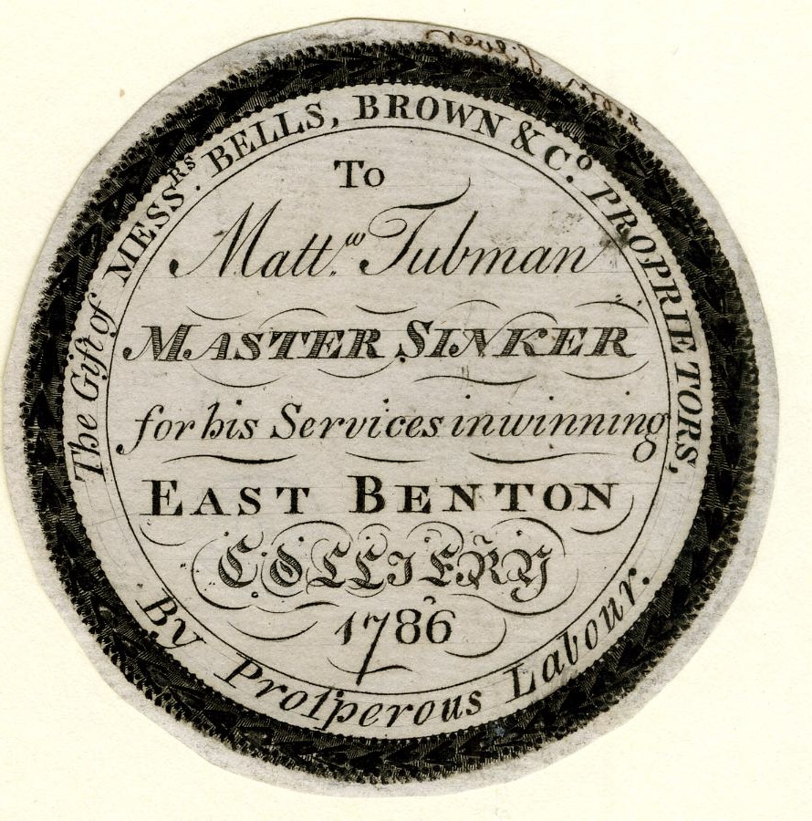 This is the obverse of the medal described by the British Museum as ‘Obverse of a commemorative medal, awarded by colliery proprietors Messrs Bells, Brown & Co to Matthew Tubman for ‘winning’ East Benton Colliery (successfully reaching a coal seam), with decorative border of garland; impression taken from silver. 1786′ (We have flipped the image on the British Museum website so that the text is readable).