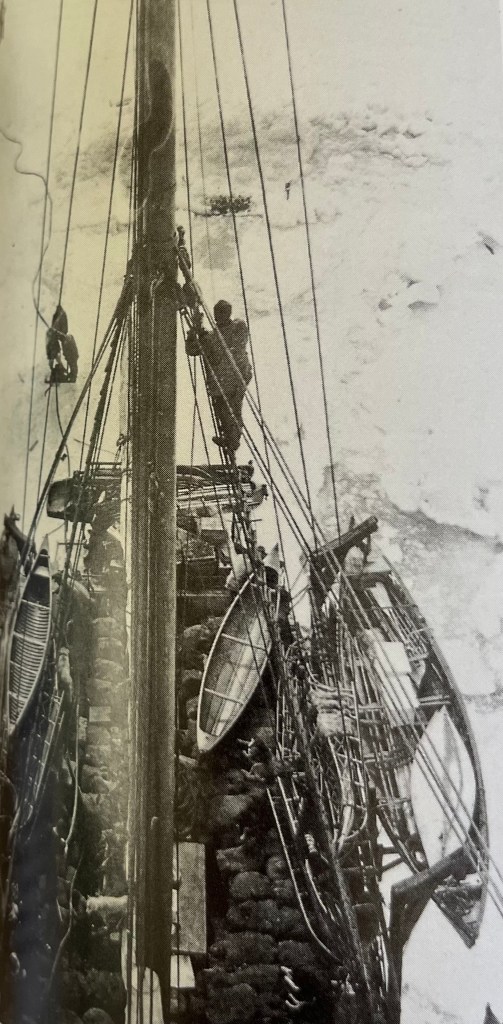 The following morning, a sound like a gun shot alerted everyone aboard to the fact that the ice, which was now pressed tightly around the side of the vessel, was suddenly cracking. Plans were made for abandoning ship. They were over 50 miles from land.