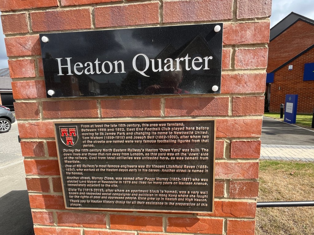 A plaque at the entrance to the estate, produced by the developers in collaboration with Heaton History Group explains the site’s importance as a sporting and railway centre.