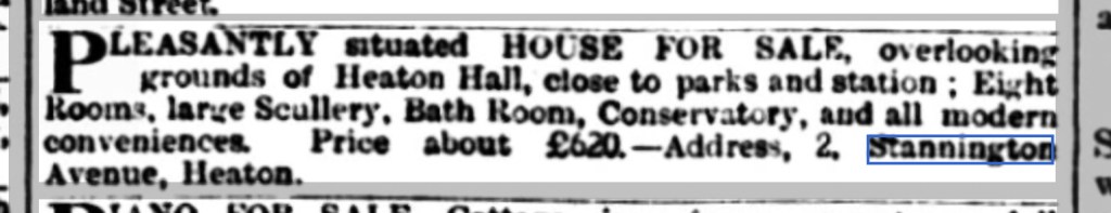 Advertising at the time made the most of the location. One the first houses in the terrace to be completed, no 2, was a few years later promoted as: ‘Pleasantly situated House for Sale, overlooking grounds of Heaton Hall, close to parks and station; eight rooms, large Scullery, Bath Room, Conservatory, and all modern conveniences. Price about £620.’